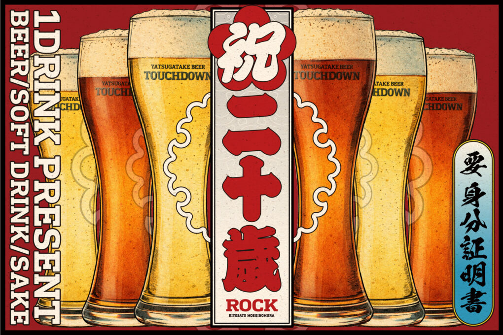 二十歳を迎えた皆様に「八ヶ岳ビールタッチダウン」を、まだ飲めない&苦手な方にはメニューからどれでも一杯プレゼント!