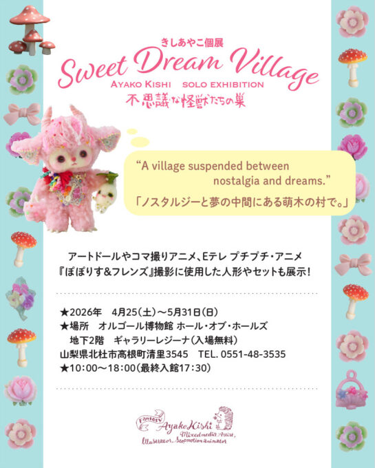 コマ撮りアニメ作家・立体造形作家・イラストレーターの「STUDIO A.CRAFT」きしあやこさんの個展『Sweet Dream Village 〜不思議な怪獣たちの巣〜』を萌木の村オルゴール博物館ホール・オブ・ホールズで開催します。