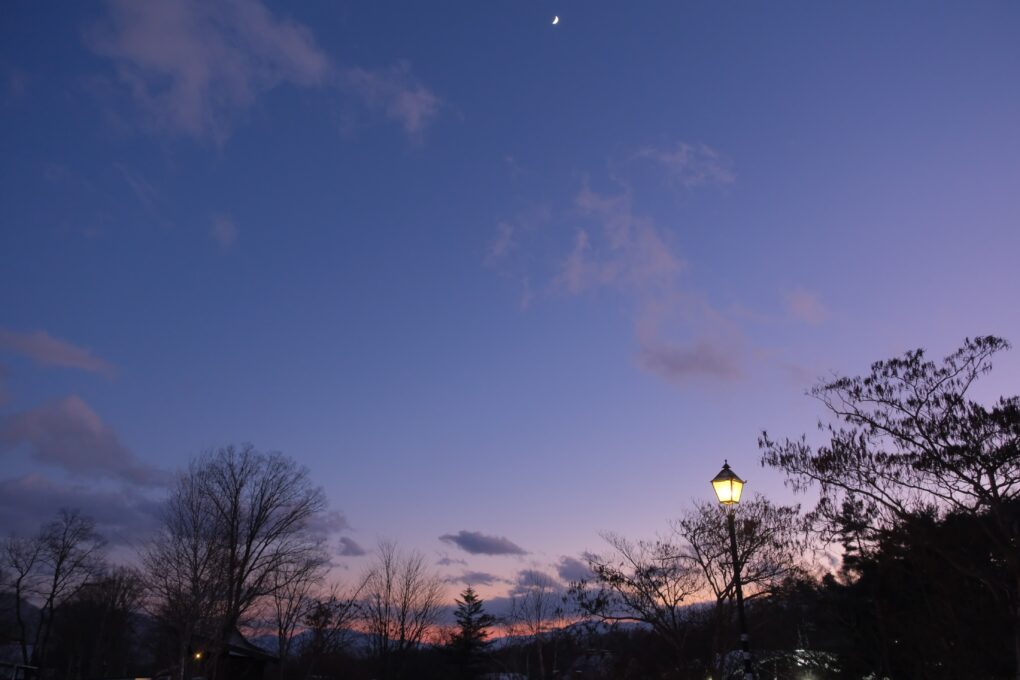 夕方には薄桃色の空も広がり、西日の中で粉雪がキラキラと。