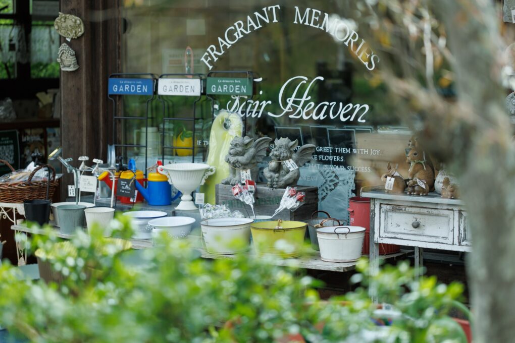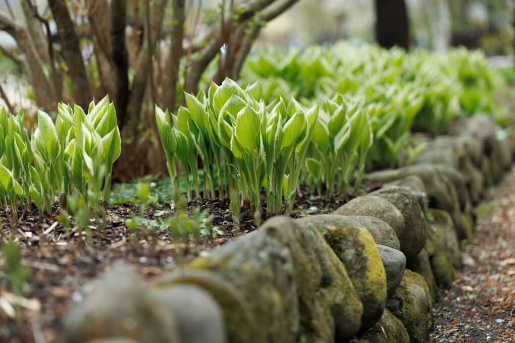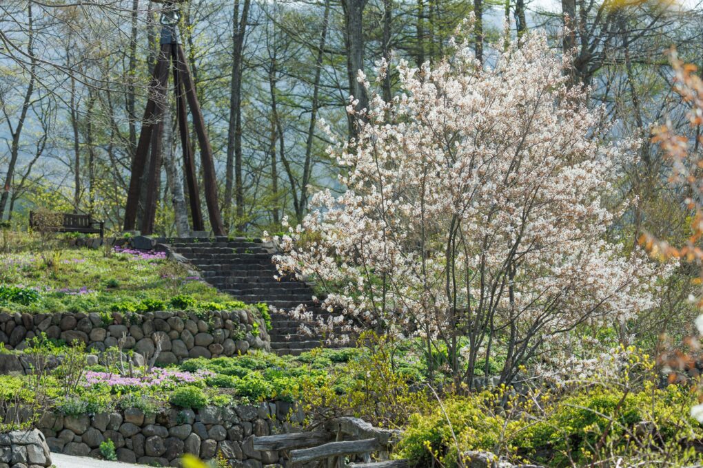 白の花が一斉に咲いたガーデンのなか、